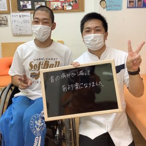 日常生活で前に首が出てしまう事が多いとは思いますが、 施術で首元の固さも取れて楽になって良かったです。 これからも痛みが出ないようにメンテナンスしていきましょうね。